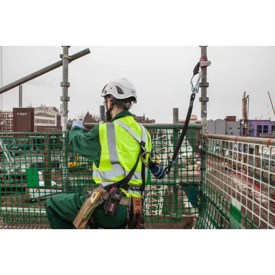 Arbeiten in der Höhe bringen das Risiko eines potenziellen Absturzes mit sich. Auffangsysteme können zwar keinen Fall verhindern, aber den Benutzer durch kontrolliertes Auffangen vor schweren Verletzungen bewahren. Das Verbindungsmittel SP-140 von Spanset® erfüllt die Norm EN 355 auch für schwerere Anwender von bis zu 140 kg Körpergewicht. Gemäss der Norm EN 361 werden Auffanggurte mit einem 100 kg schweren Stahltorso geprüft. Dieser Torso durchfällt eine vorgegebene Sturzstrecke von 4 Metern und wird dann von einem Seil ohne Falldämpfung aufgefangen. Dabei muss nachweislich mindestens die Kraft von 1,5 Tonnen (15 kN) auf den Torso einwirken - der menschliche Körper würde einen solchen Sturz nicht überleben. Ein Bremsmechanismus begrenzt deshalb die auf den Menschen einwirkende Kraft auf maximal 600 kg (6 kN).