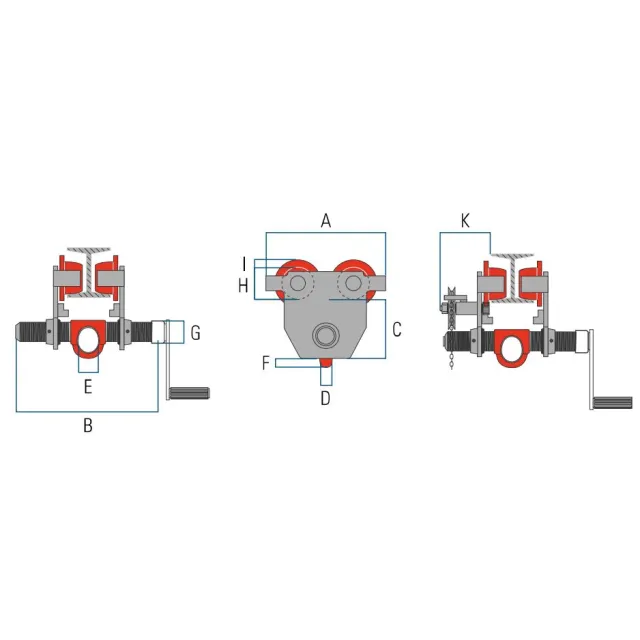 Mit Haspel-Kettenantrieb, Breite verstellbar. Schnelle und einfache Montage dank entfernbarer Kurbel. Standard-Haspelkette Länge 2,5 m, kann individuell verlängert werden. Auf Anfrage für Trägerbreite bis 320 mm und mit einer Tragkraft von 20000 kg.