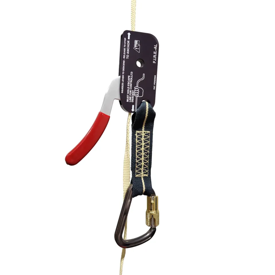 - Press the descender's lever to initiate your descent, controlling the speed by managing the brake hand to allow the escape webbing to pass through smoothly.